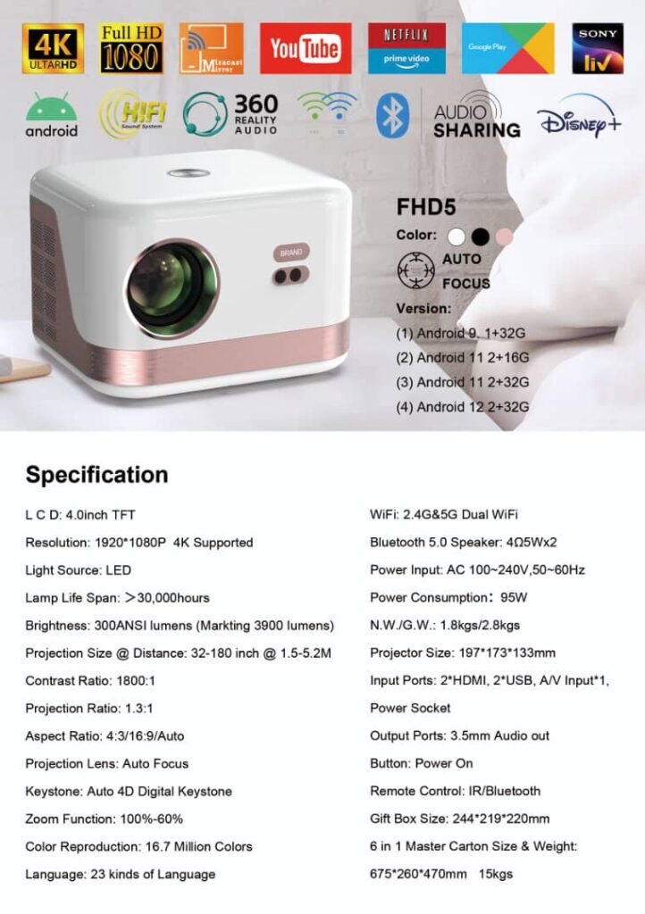 Videoprojecteur FHD5 LED 300ANZI(Lumens 3900),1920X1080,4K, Wifi, Bluetooth, 2xHDMI,2xUSB,A/V input, Auto Focus